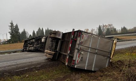 Semi-truck rollover blocks I-5 in Castle Rock; driver cited for negligent driving